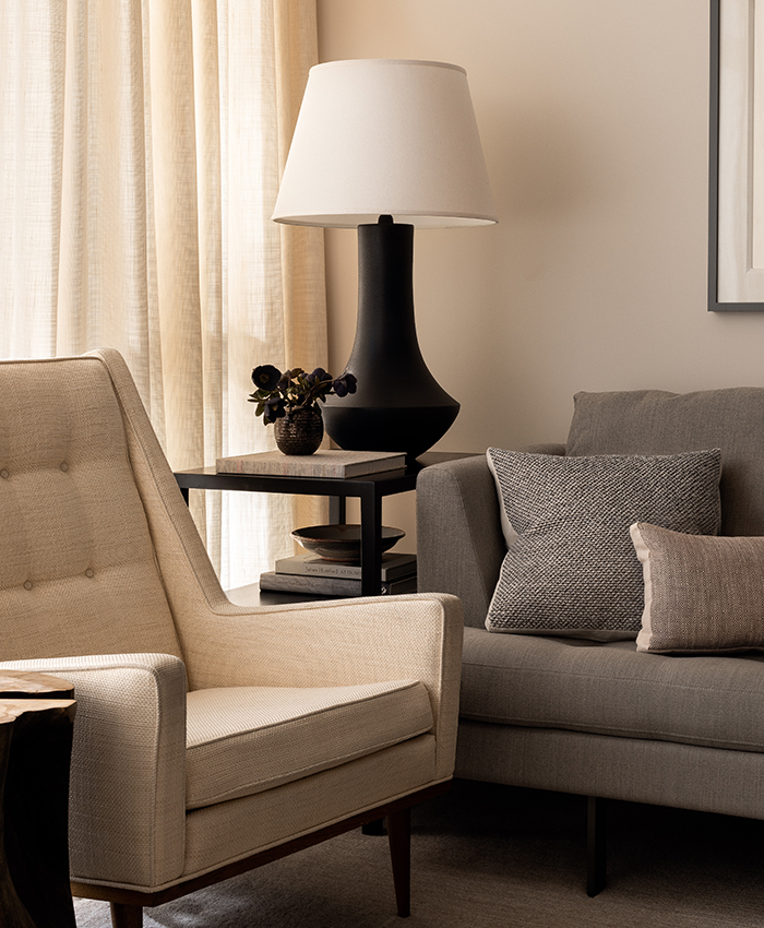 With a subdued, quiet interior envelope provided by the developers, OreStudios selected fixtures and furnishings to compliment the newly constructed space. A new custom office was also designed and realized with Kerf Design. Chalky linens, beige and taupe carpets and gray wool upholstery create an inviting palette that references the city and sound outside the floor to ceiling windows. Generous curtains and plenty of warm wood finishes prevent the space from feeling sterile or cold. Works from local artists including Paul Horiuchi and Morris Graves add to the distinctly regional perspective of this home.